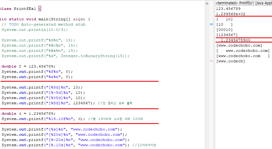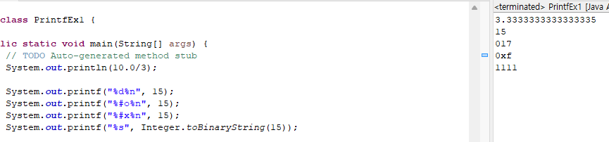 System.out.printf() | %e, %E | 지수 표현식 형식으로 출력 | |