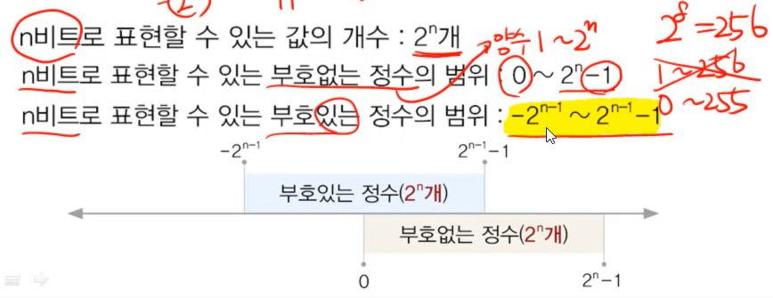 n비트로 표현할 수 있는 부호 있는 정수의 범위: -2^(n-1) ~ 2^(n-1) - 1
