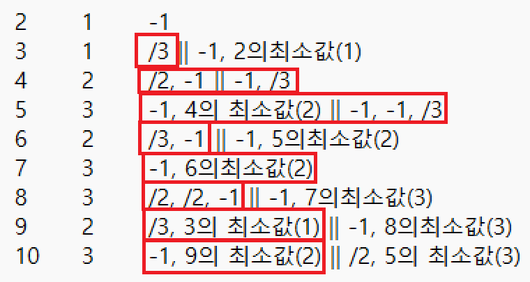 그전수의 최소값에 1을 더하거나(-1한 것) 3이나 2로 나눈 몫에 1을 더하거나(나눈 연산) 하면 된다는 규칙이 보인다